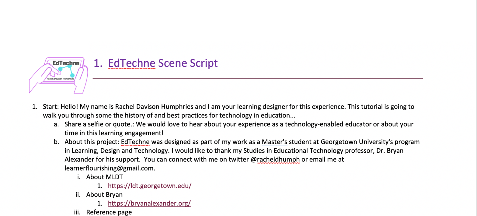 About this project: EdTechne was designed as part of my work as a Master’s student at Georgetown University’s program in Learning, Design, and Technology. I would like to thank my Studies in Educational Technology professor, Dr. Bryan Alexander for his support. You can connect with me on twitter @racheldhumph or email me at learnerflourishing@gmail.com.